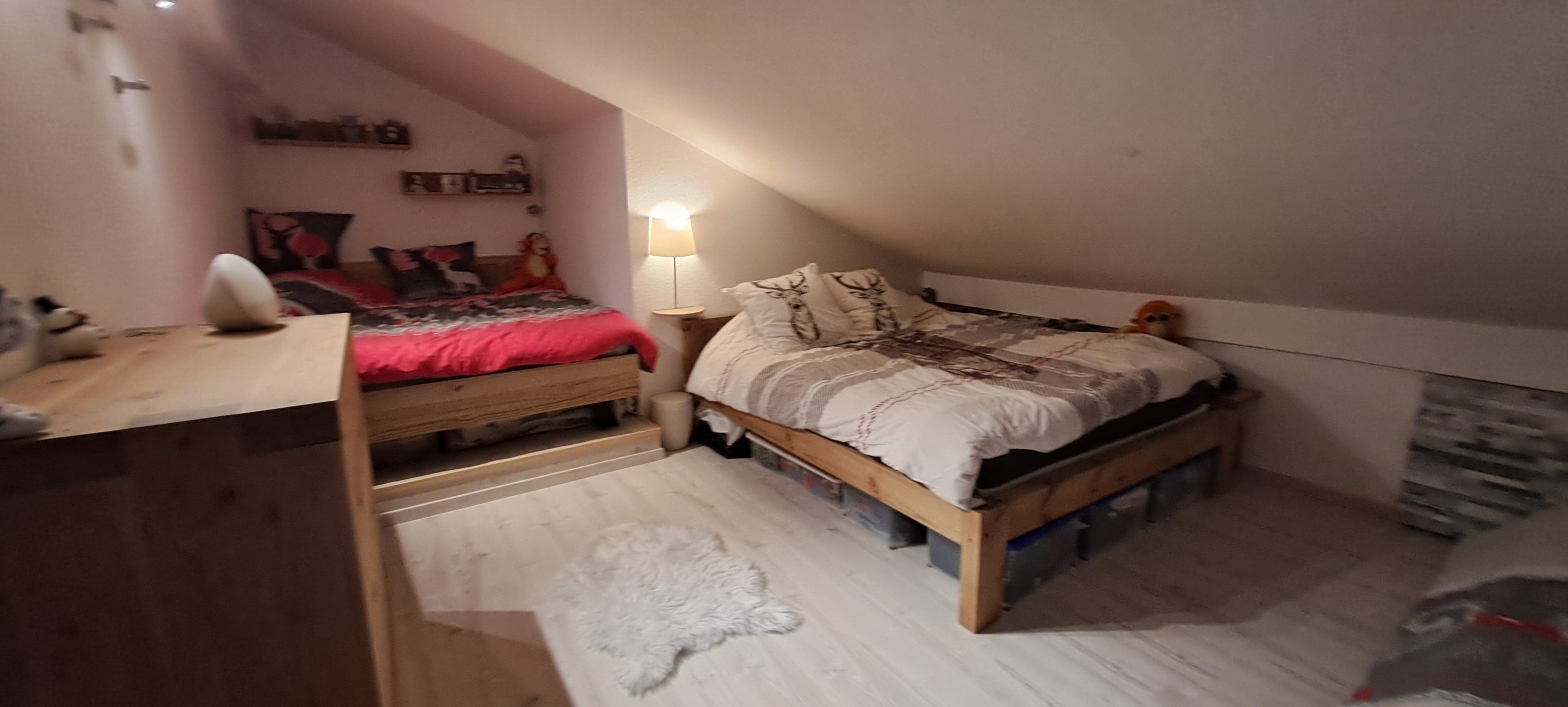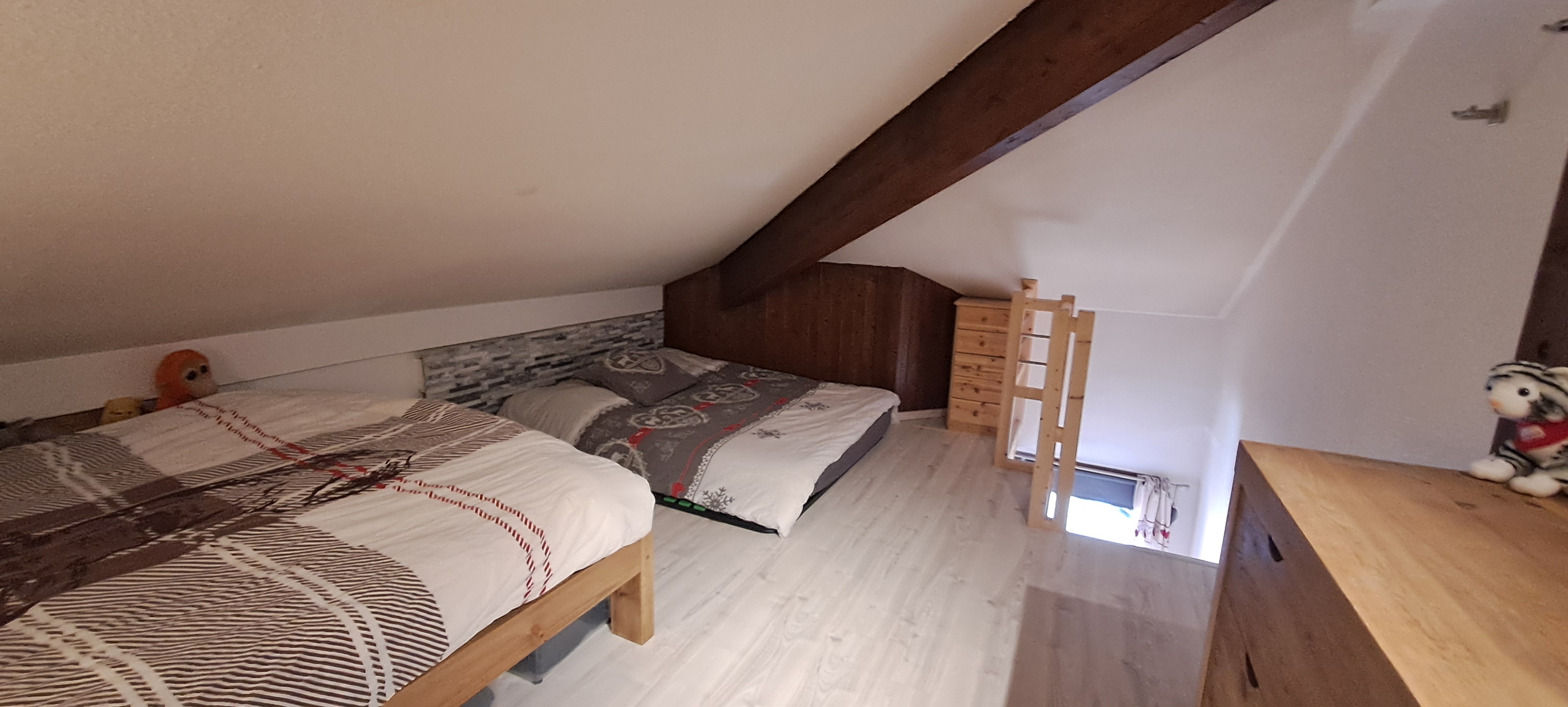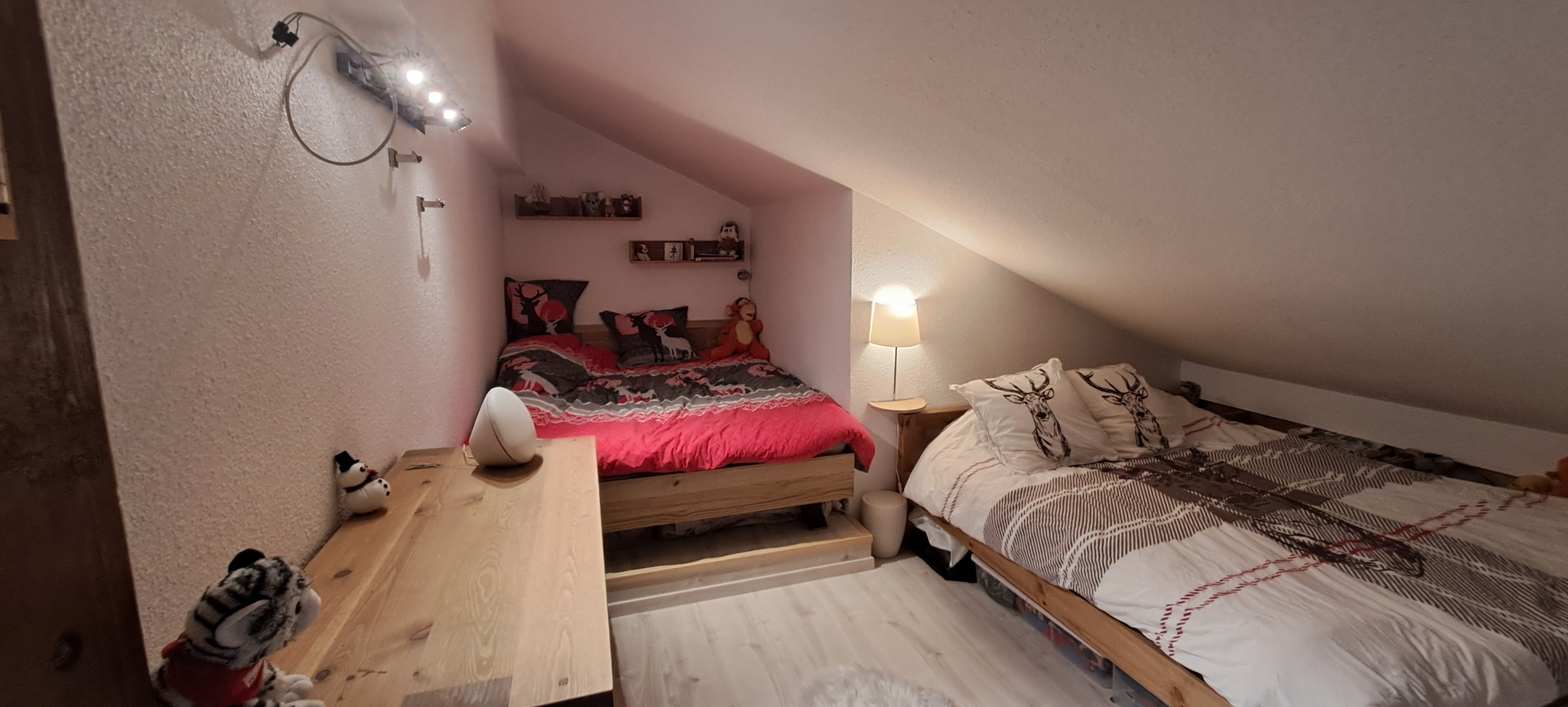 Il propose une organisation intelligente et surtout une surface utile bien supérieure grâce à ses combles aménagés et sa mezzanine, accueillant une grande chambre type dortoir avec trois grands lits, pouvant très facilement être transformée en plusieurs espaces nuit. L’idéal pour recevoir famille et amis sans se marcher dessus.
